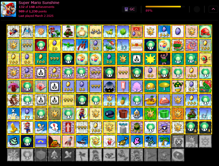 Started this run on November 22 2024 and have been slowly gathering all the achievements for this game, as it's my favorite Super Mario game in the series next to Odyssey. I've been on and off for quite awhile though in terms of getting this to 100% it's going to take awhile longer to complete it due to some of the more difficult achievements. I'm saving Corono Mountain for when I get done with said harder achievements so that's why the game hasn't been 'beaten' yet. I have 119/120 shines and it was my first time getting all the blue coins in Sunshine, very proud of that at least. :D